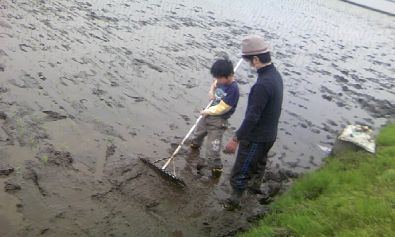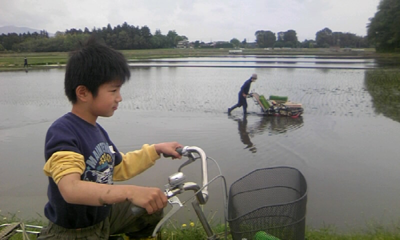筑波山の南10kmほどにある田園地帯です。毎年、ゴールデンウイ―クに田植えを手伝います。 父は中学時代からやっていたようです。天気予報では午後から雨 とのこと。午前中のうちに終わ らせようと考えました。画像は二列ずつ植えられる田植え機を押す私です。 息子にも手伝わせました。植える前の田ならしです。トンボで泥を平らにします。 手前は自転車に乗る息子、奥は田植え機を押す私です。 絵画的遠近法で対比させようとしたのでしょうか。撮影は妻です。